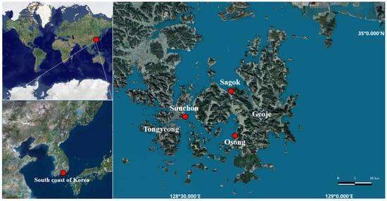 The study sites located in Geoje Bay (Osong, Sagok) and Tongyeong Bay (Sunchon), South coast of Korea.
