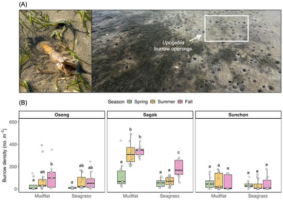 Mud shrimp bioturbation in intertidal seagrass Zostera japonica. (A) Photo illustration of mud shrimp Upogebia major (left) and its extensive burrowing activities in Z. japonica habitat and adjacent mudflat (right). (B) Upogebia burrow density (no. m−2) in seagrass and adjacent unvegetated mudflat in Osong, Sagok, and Suncheon during spring, summer, and fall. Data points indicate raw burrow density measurement. Different letters indicate significant pairwise differences among habitat × season groups within each site (Tukey post hoc tests with Holm correction, p < 0.05).