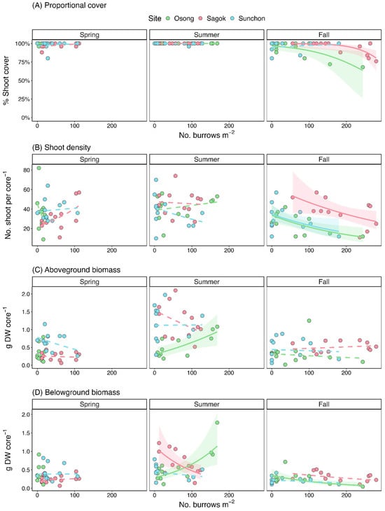 Seasonal changes in Z. japonica vegetation metrics are summarized in Table 1. Burrow density interacted with season and site to influence multiple structural attributes of Z. japonica vegetation. Percentage shoot cover declined significantly with increasing burrow density (binomial GLM, χ2 = 6.05, p = 0.014), with marginally significant interactions observed between site and season (χ2 = 5.55, p = 0.06) (Figure 3A). Similarly, shoot density showed a negative association with burrow density (negative binomial GLM, χ2 = 8.45, p = 0.004); was significantly influenced by burrow density × season (χ2 = 8.02, p = 0.005) and site × season interactions (χ2 = 11.19, p = 0.004) (Figure 3B). For belowground biomass, a significant main effect of burrow density was detected (gaussian GLM, F1,60 = 7.57, p = 0.008), along with a strong site × season interaction (F2,60 = 5.31, p = 0.008) (Figure 3D). In contrast, aboveground biomass showed no significant association with burrow density but varied significantly by site (F2,60 = 8.45, p < 0.001) (Figure 3C). Examination of within–group regression slope estimates indicated that significant negative relationships between burrow density and vegetation metrics were restricted to fall.
