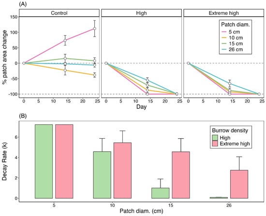 Effects of Upogebia bioturbation and initial patch size on the growth and decay of seagrass transplant during 24−day field experiment. (A) Percentage changes in patch area under different intensities of Upogebia bioturbation. Patch areas were measured on day 14 and 24, and different colors represent different patch size treatments. (B) Mean ± 1SE decay rate (k) of different patch size treatment under high (green) and extreme high (pink) bioturbation. Decay rate was derived from fitting the remaining % patch area with an exponential decay model.
