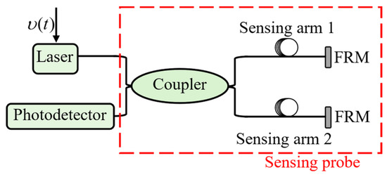 Figure 1 shows a Michelson interferometric hydrophone that uses PGC. A laser at optical frequency enters the Michelson interferometer (MI) within the dashed box, forming the sensing probe of the fiber-optic hydrophone. Two output ports of the fiber coupler connect to single-mode fibers terminated with Faraday rotation mirrors (FRMs) to suppress polarization fading. Acoustic pressure modulates the optical phase difference (OPD) of the two sensing arms.