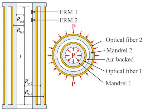 The pressure sensor consists of two thin-walled elastic mandrels arranged coaxially, as shown in Figure 2. Fiber 1 is coiled on the inner mandrel (tube 1), and fiber 2 is coiled on the outer mandrel (tube 2). The outer surface of tube 2 and the inner surface of tube 1 are subjected to water loading, while the opposite surfaces are air-backed, creating differential pressures.