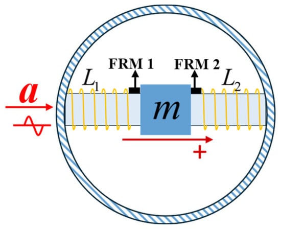 Define the positive axis as the vector from the mandrel coiled with fiber to the mandrel coiled with , as shown in Figure 3. Positive acceleration compresses the left mandrel and stretches the right mandrel. Mandrel-generated strains transfer to the coiled fibers. The compressed mandrel undergoes axial shortening with Poisson-effect-induced radial expansion, increasing coiled fiber length and producing phase shift . Conversely, the stretched mandrel experiences axial elongation with radial contraction, decreasing coiled fiber length and generating phase shift . According to the elastic mechanics model of the accelerometer [9],