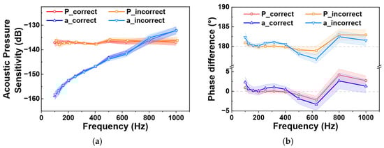 Figure 7 shows that P_correct and P_incorrect have nearly identical sensitivities (≈−137 dB re 1 μPa) but differ by 180° in phase. Critically, the P_correct configuration yields phase difference of 0.52° ± 0.7° at 400 Hz. Only P_correct accurately measures acoustic pressure with phase shifts within ±5°.
