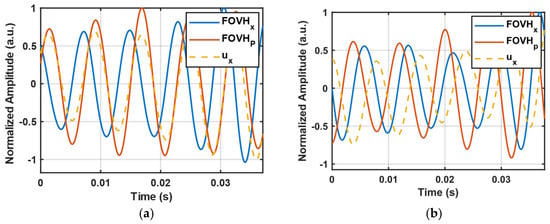 Section 2.1 explains that, according to the plane wave theory, acoustic pressure and particle velocity are in-phase, and the acceleration leads them by , provided that the radial direction outward from the sound source is defined as the positive direction. Figure 10 shows the results at 125 Hz, where represents the accelerometer’ x-channel output and is its integral. Figure 10a,b show outputs when the x-channel’s LA mandrel faces toward and away from the source, respectively. The vertical axes show normalized channel amplitudes, and the horizontal axes represent time.
