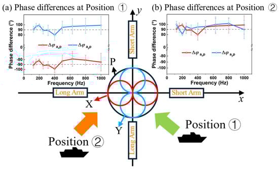 Figure 11 presents multi-frequency results of phase differences between pressure sensor and accelerometer at various positions, with error bars representing the standard deviation. Ten independent trials were conducted at each position. Positions ① and ② along the LA direction of y-axis yield a 90° phase difference between accelerometer’s y-channel and the pressure sensor outputs, confirming that the accelerometer’s positive axis is defined by the vector from the LA to the SA. Positions ① and ② along the LA and SA directions of x-axis produce phase differences of +90° and −90°, respectively, further validating this polarity convention.