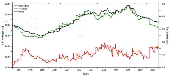 Comparison of sea surface temperature (SST) between the Nature Run (NR, green line) and the Free Run (FR, black line) over the year 2023. The root mean square error (RMSE) between the temperature fields is shown by the red line, with its scale indicated on the secondary y-axis (right).