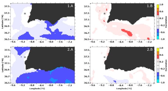 A similar pattern is observed in the maps shown in Figure 4, which correspond to the western reference point influenced by upwelling. Again, panels 1.A and 2.A show the correlation with salinity at the surface and 100 m, while 1.B and 2.B refer to the correlation with horizontal currents. As in the southern region, SST is negatively correlated with salinity in the ensemble, and this correlation intensifies with depth. The relationship with currents shows a limited positive correlation near the surface that diminishes with depth, indicating that there is only a modest association between thermal variability and current patterns within the ensemble in this area as well.