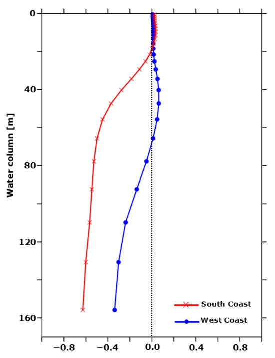 Given the consistent negative correlation patterns between SST and salinity observed in Figure 3 and Figure 4, a vertical profile analysis was conducted to further investigate this relationship throughout the water column. Using the same two reference locations, the correlation between the surface SST and salinity values was computed at increasing depths at each respective point. Hence, for each spot, the correlation was computed over time across all ensemble members and repeated for all vertical salinity levels in the model. The results (Figure 5) reveal a clear intensification of the negative correlation with depth. The red curve represents the profile for the southern coast reference point, while the blue curve corresponds to the western location. In both cases, the strength of the inverse relationship increases steadily with distance below the surface, confirming that the inverse relationship between temperature and salinity becomes more pronounced with depth in the ensemble.