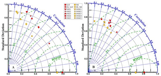 The Taylor diagrams present the statistical properties (standard deviation, correlation, and root mean square difference, RMSD) for OSE1–OSE5 and OSSE1–OSSE5, as well as the Free Run (FR_SAT) relative to the NRT ODYSSEA satellite data (SAT) and the Free Run (FR_NR) relative to the Nature Run (NR). Panel (A) shows the results immediately after the EnOI update, and Panel (B) shows the results seven days later.
