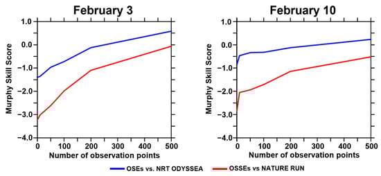 Finally, an additional metric was used to further assess the system’s behaviour: the Murphy Skill Score (MSS), as defined in Equation (A7). For the OSE experiments, the NR values in the equation were replaced by the corresponding satellite product, which served as the observational reference. In the OSSE experiments, the NR values remained the reference dataset, reflecting the synthetic nature of these experiments. The results for the experiments based on the NRT ODYSSEA satellite product are shown in Figure 8. Each panel illustrates how the MSS varies with the number of assimilated observation points, with the left panel representing the moment immediately after the EnOI update (3 February) and the right panel representing the results from the sampling seven days later (10 February).