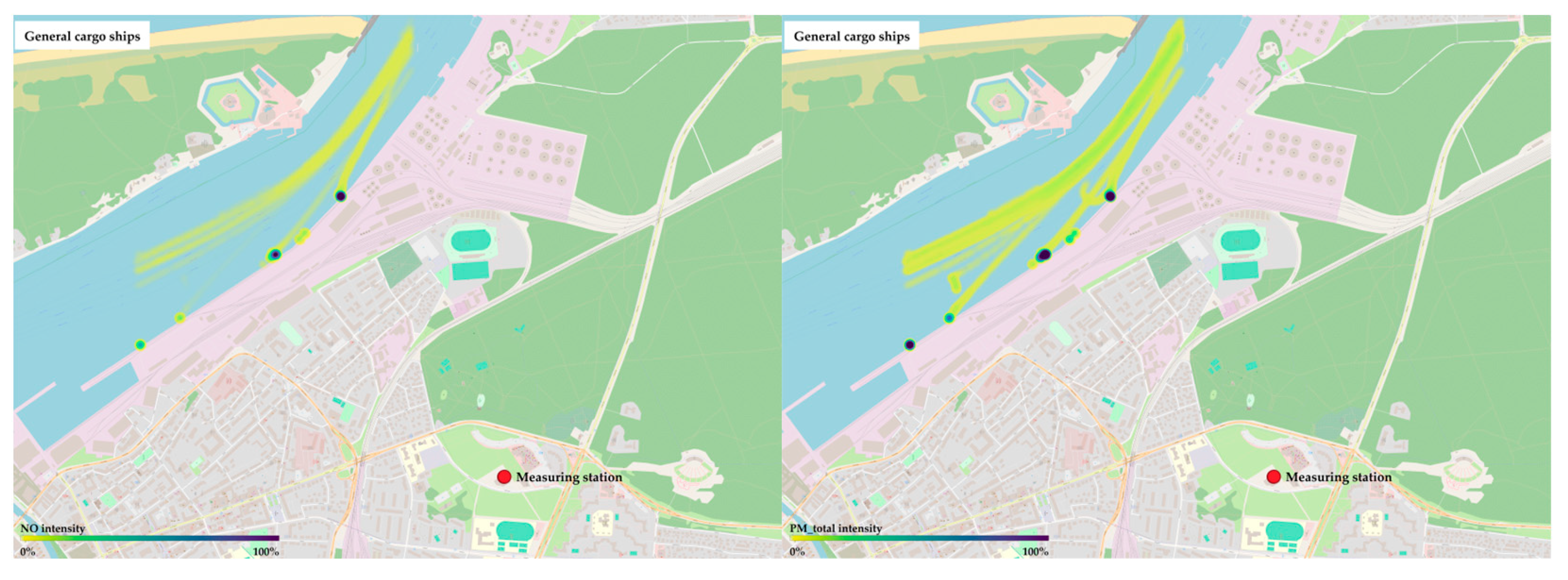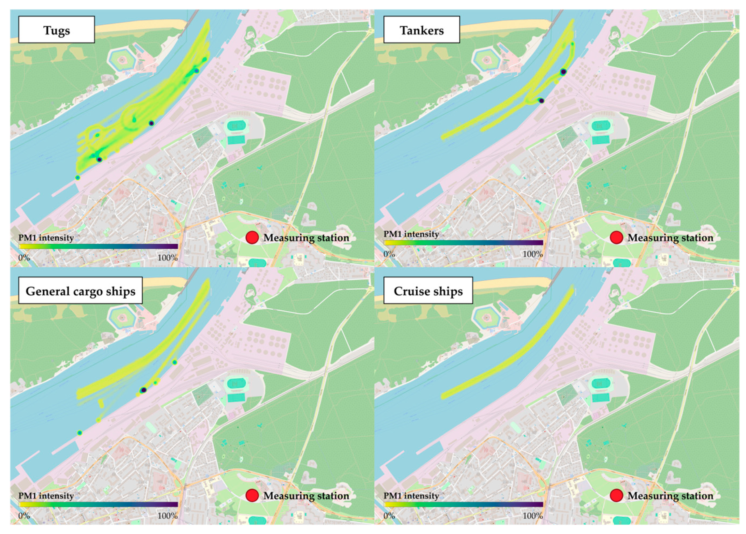 - Chevet, E.; Boiron, O.; Anselmet, F. Modeling of Air Pollution Due to Marine Traffic in Marseille. Atmos. Environ. 2024, 329, 120542. [Google Scholar] [CrossRef]