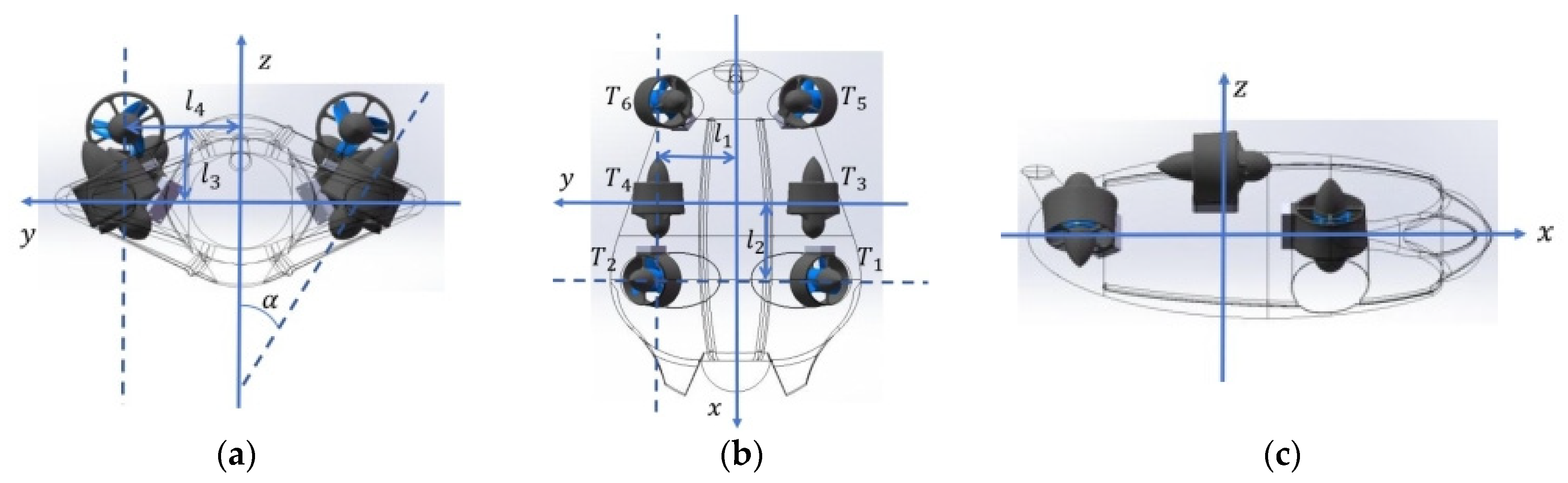 To clearly illustrate the spatial arrangement of the thrusters with respect to the AUV’s body-fixed coordinate system, a three-dimensional isometric projection is employed. The thruster layout and its relationship to the vehicle geometry are further presented through the orthographic views shown in