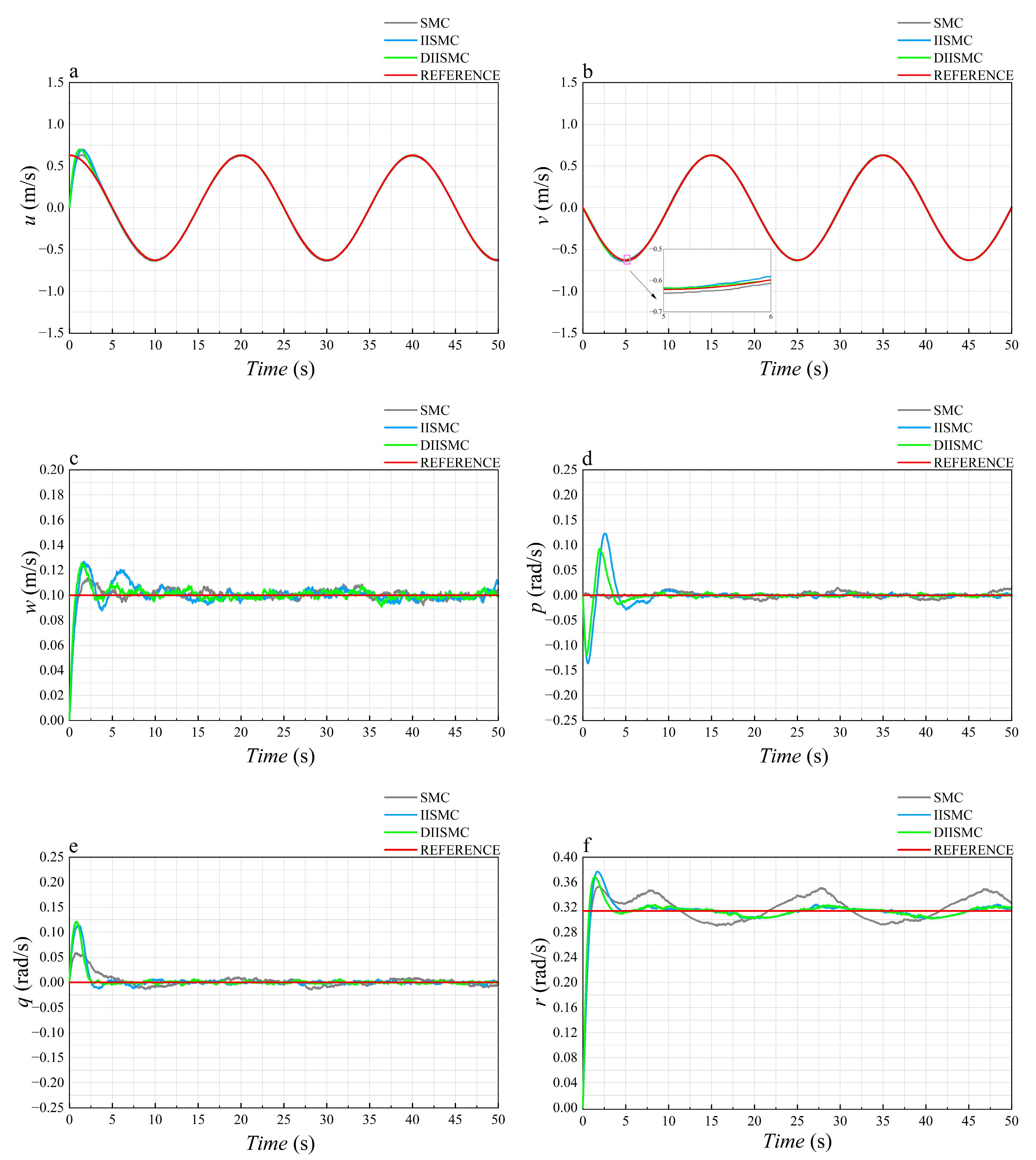 Figure 9f, the yaw angle tracking error, SMC and IISMC show varying degrees of lag, while DIISMC does not exhibit this issue, highlighting its rapid response advantage. However, for the velocity errors presented in