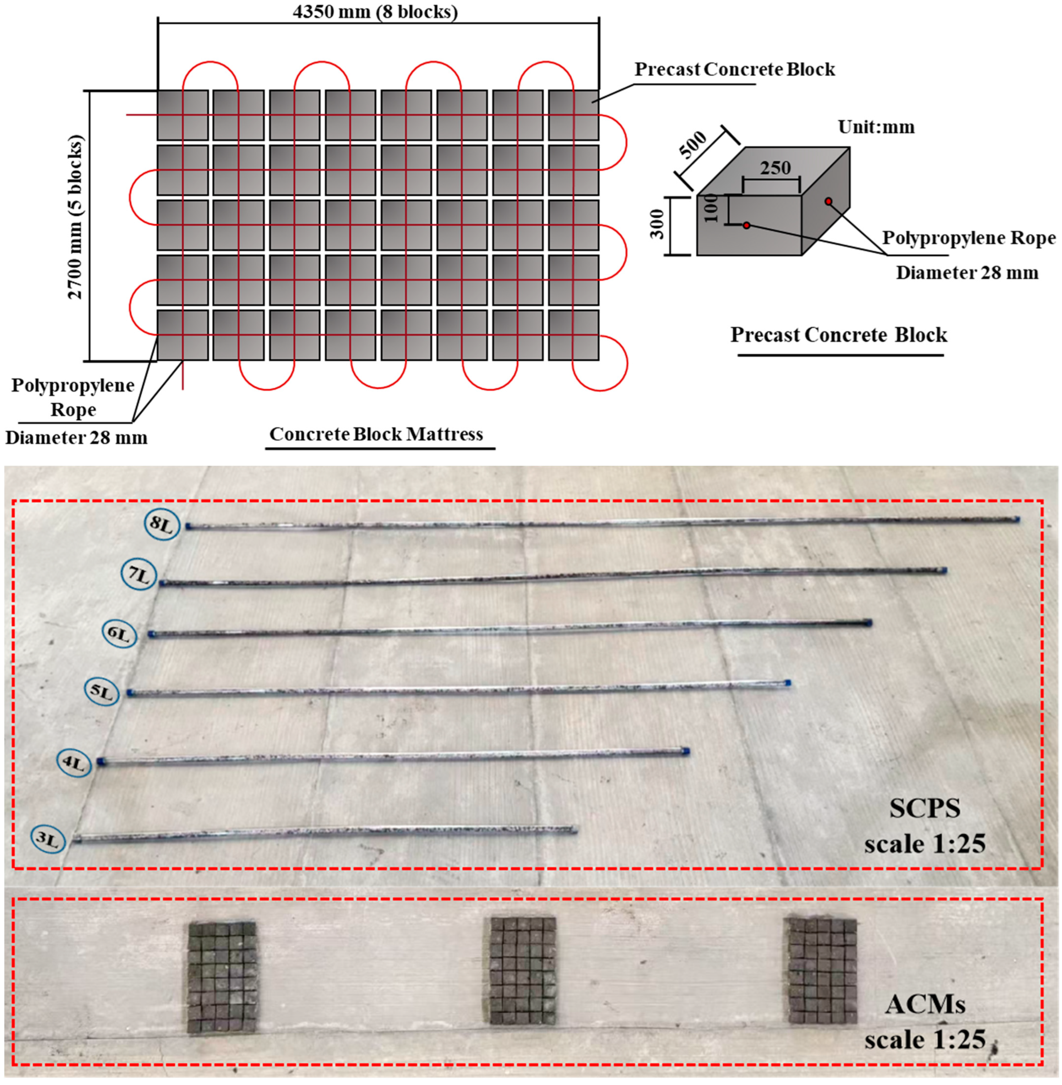 23] are not considered. Based on physical model experiment and theoretical analysis methods, the stability of SCPS covered by ACMs is investigated. The core contents include the following: revealing the synergistic force transfer and instability mechanism between ACMs and SCPS; and establishing a quantitative relationship between the cover spacing and the critical instability velocity of SCPS-ACMs. This study aims to fill the research gap in the stability of SCPS covered by ACMs at intervals on the flat hard seabed.