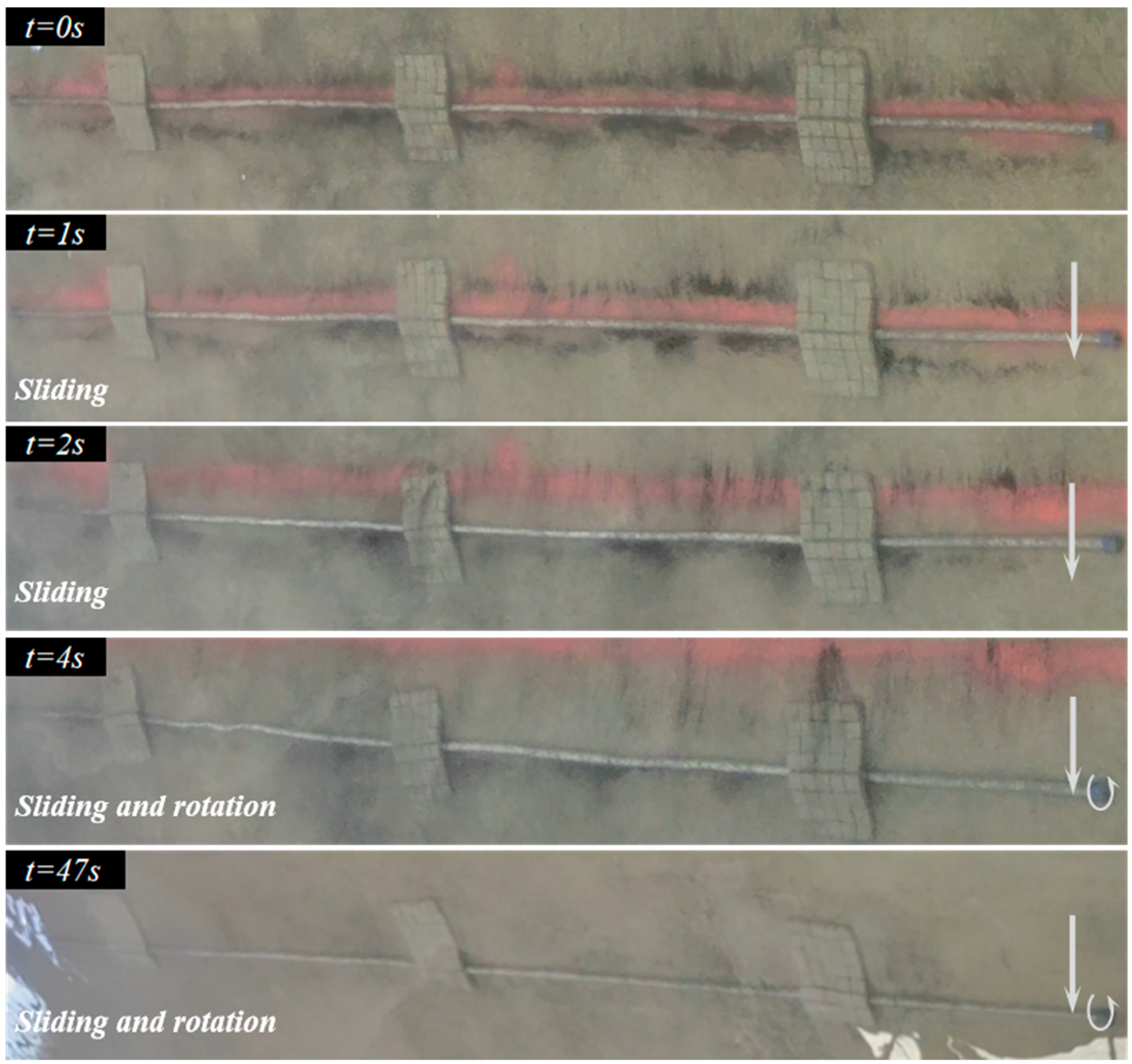 Figure 9, the measured values are slightly lower than the theoretical results. This deviation is attributed to the instability mode observed in the experiment: the cable rapidly transitions from the initial minor translation to rolling. The rolling motion changes the contact form between the SCPS and the hard seabed from “line contact” to “surface contact”, resulting in a significant reduction in static friction resistance; at this time, the resistance that the SCPS needs to overcome to transition from the static stable state to the moving state decreases, and the corresponding hydrodynamic force threshold decreases, thereby reducing the critical velocity.