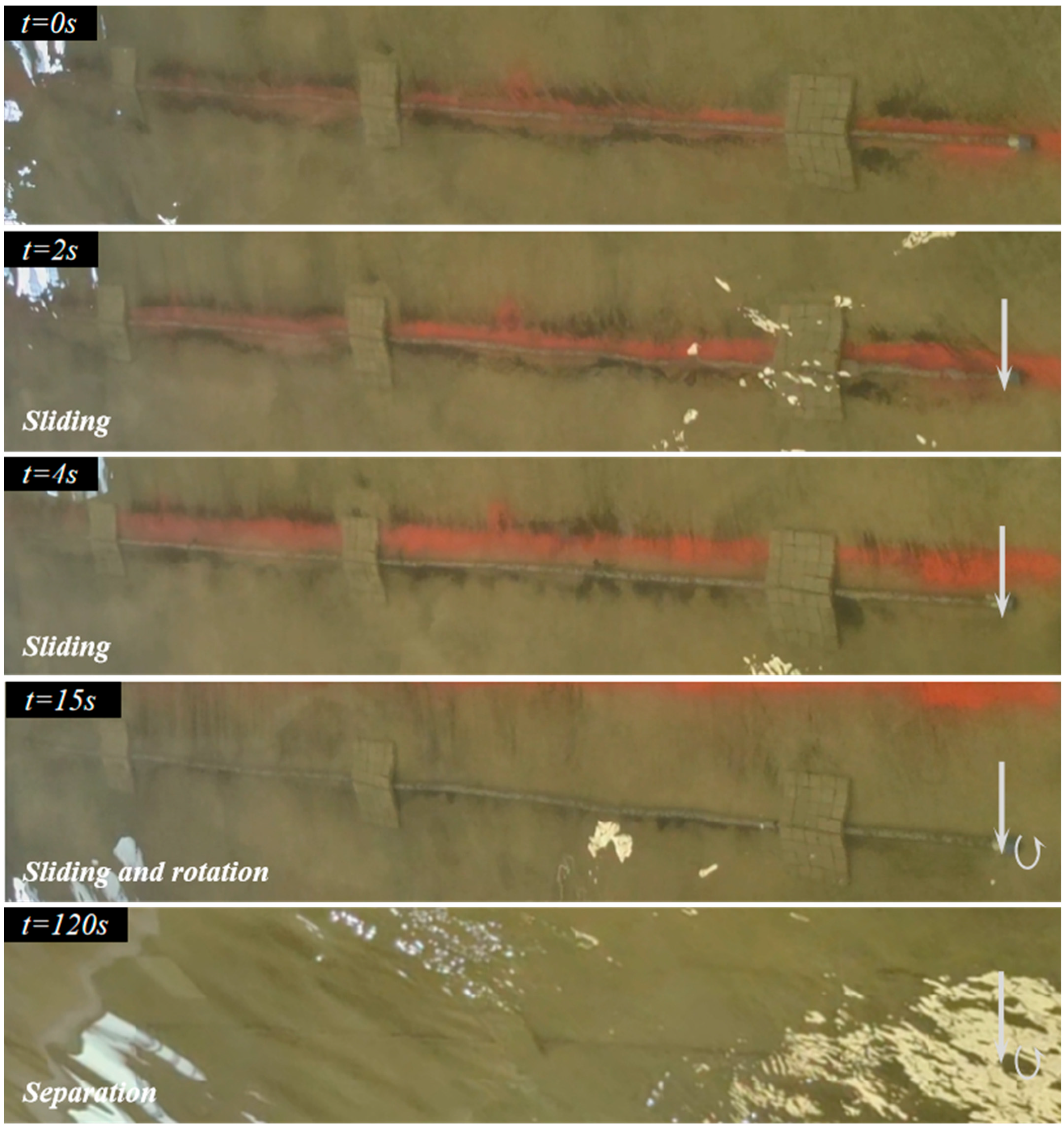 Lm, and covering pattern -L-L-L-). At the initial stage of the experiment, as the incoming flow velocity increased slowly from 0, the overall structure remained stable throughout. However, when the flow velocity approached the critical velocity, the SCPS and ACMs slid forward slowly and synchronously—this indicates that the total constraint force exerted on the SCPS by the ACMs and hard seabed was greater than the frictional force between the ACMs and flat hard seabed. Shortly after that, however, the movement mode of the SCPS shifted from translation to a combination of translation and rotation. The occurrence of rotation significantly reduced the frictional resistance exerted by the flat hard seabed on the SCPS, causing its moving speed to accelerate and, subsequently, exceed the sliding velocity of the ACMs—in other words, the SCPS attempted to break away from the bottom of the ACMs. Nevertheless, after a brief force adjustment, the SCPS and ACMs resumed the mode of synchronous forward movement.
