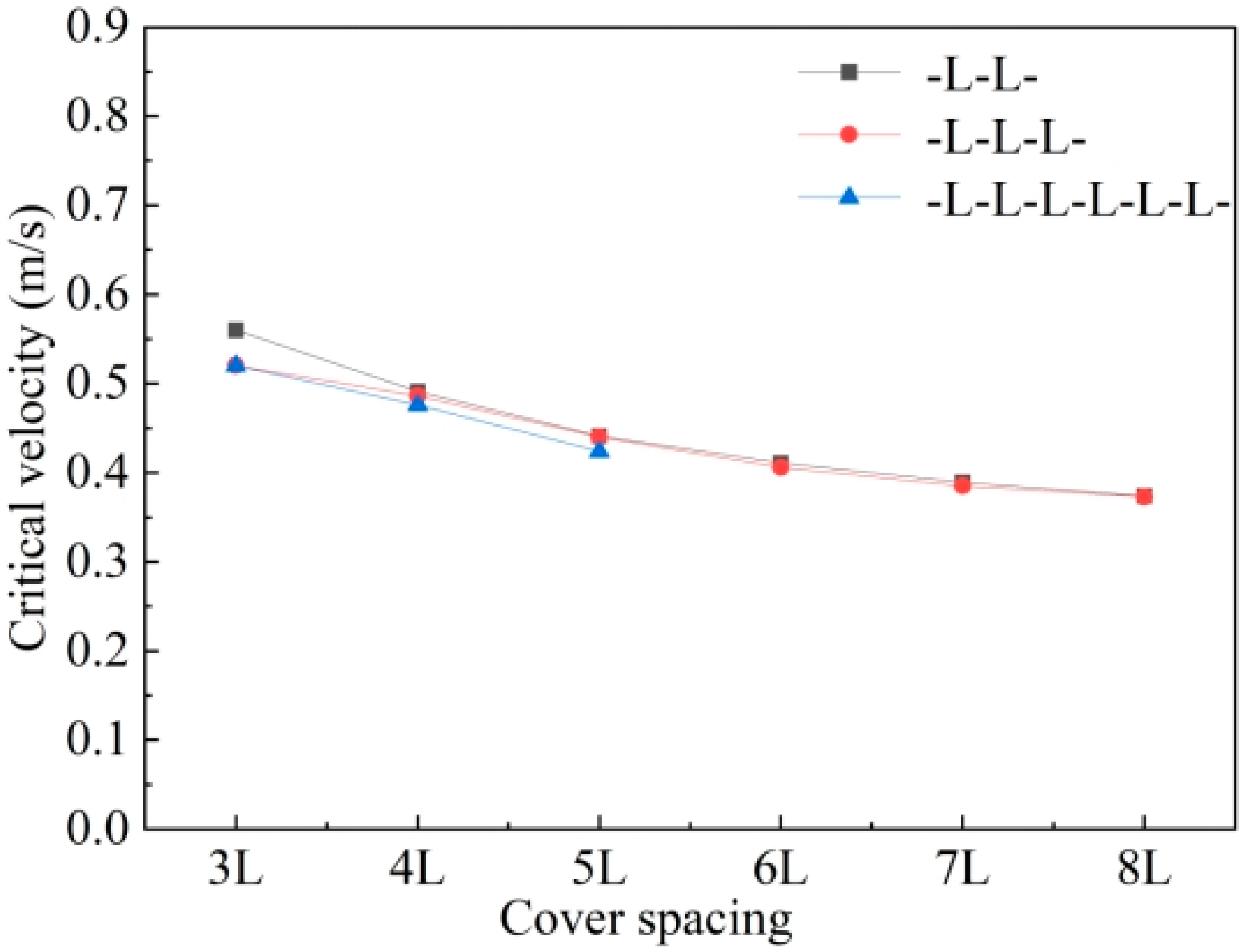 Based on Equation (8) and the determined key coefficients, the quantitative relationship between the critical instability velocity of the submarine SCPS and the cover spacing of the ACMs can be obtained. Since this study has systematically carried out stability tests on three core covering forms (-L-L-L-, -L-L-L-L-L-L-, and -2L-2L-2L-) in