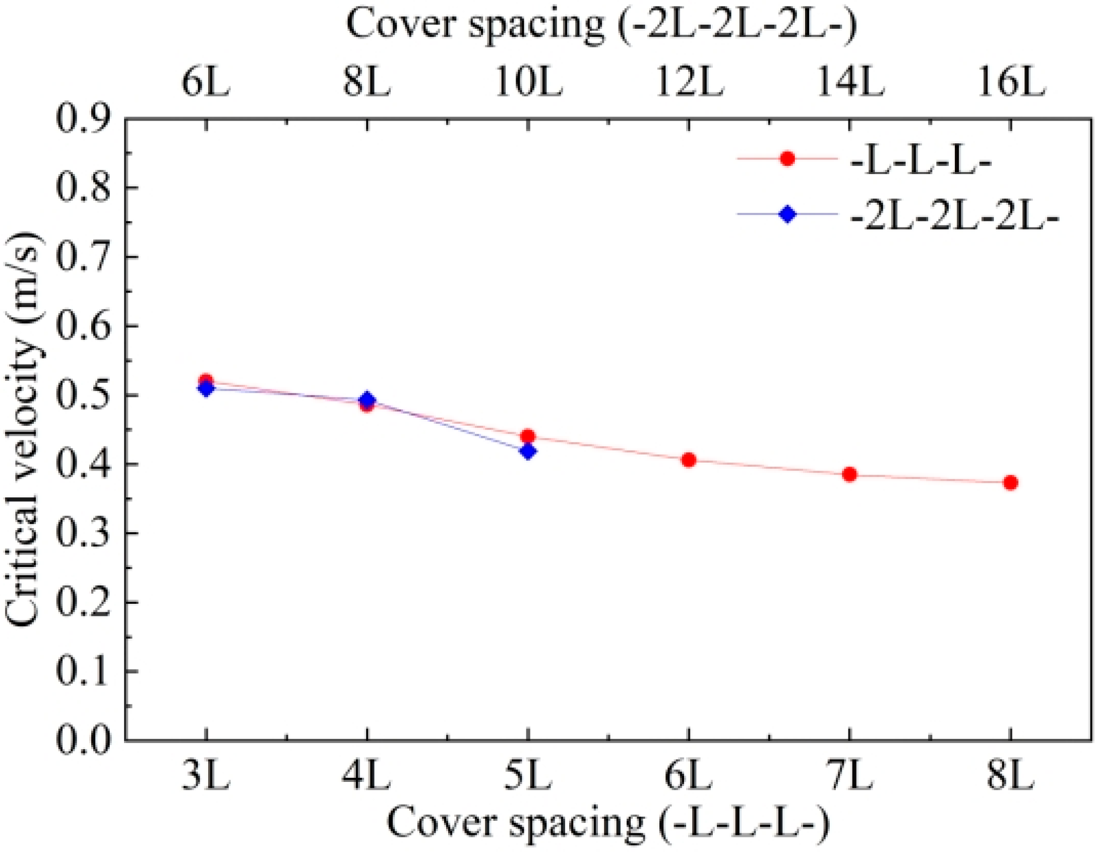 It can be observed from the figure that, if the mattress length and cover spacing are increased to twice their original sizes simultaneously, the critical velocity of the SCPS remains essentially unchanged. This phenomenon indicates that the mechanical properties of the SCPS covered by ACMs at intervals—more specifically, its hydrodynamic properties—are basically unaffected by the mattress length.
