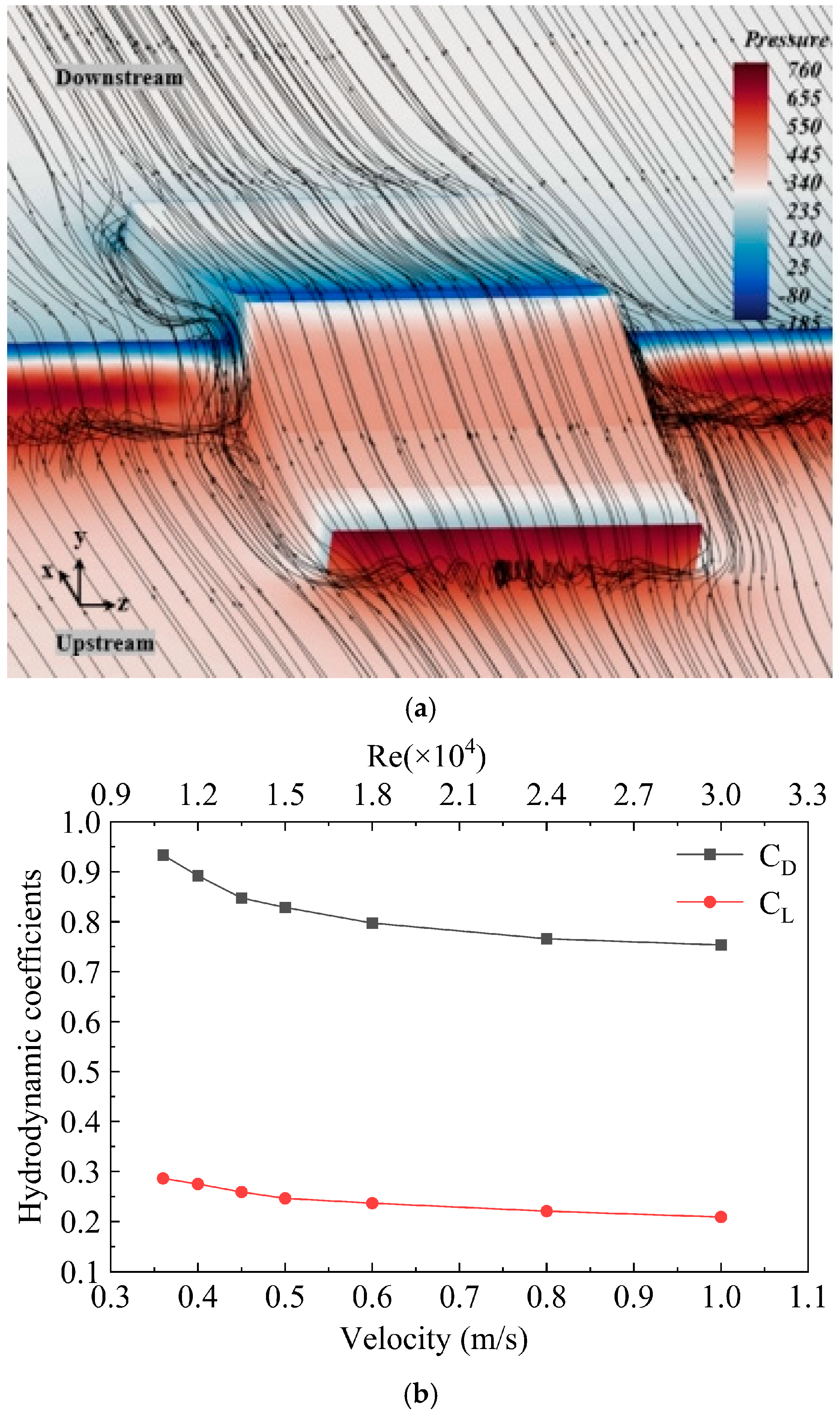 Figure 11b. These coefficients decrease slightly with increasing flow velocity and gradually reach stable level. For theoretical analysis, the average values within the experimental velocity range are adopted: drag coefficient