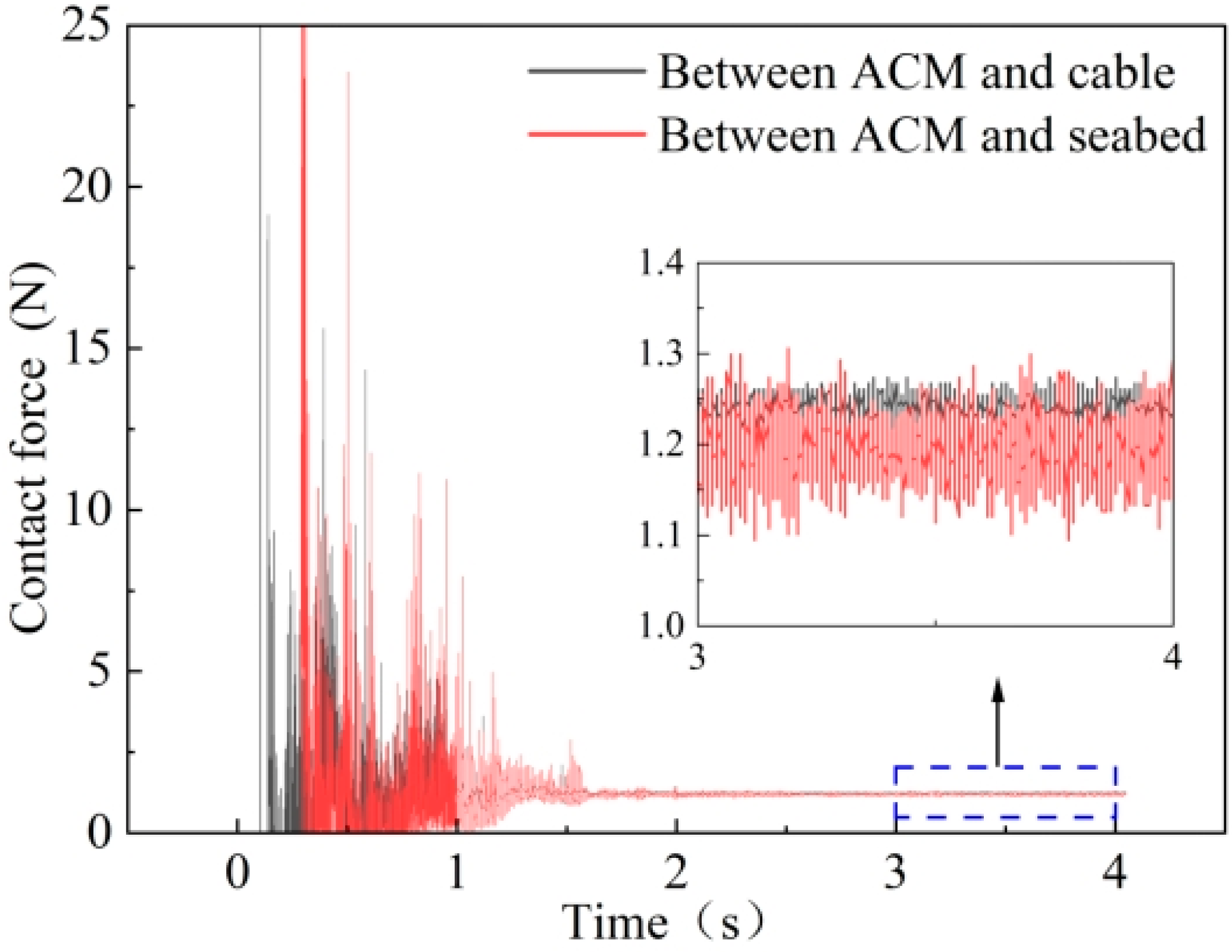 Figure 13 shows the contact forces between a single ACMs and the SCPS (1.24 N) and between the ACMs and the seabed (1.19 N). Their sum equals the underwater weight of the ACMs (2.43 N). Thus, the weight distribution coefficients are