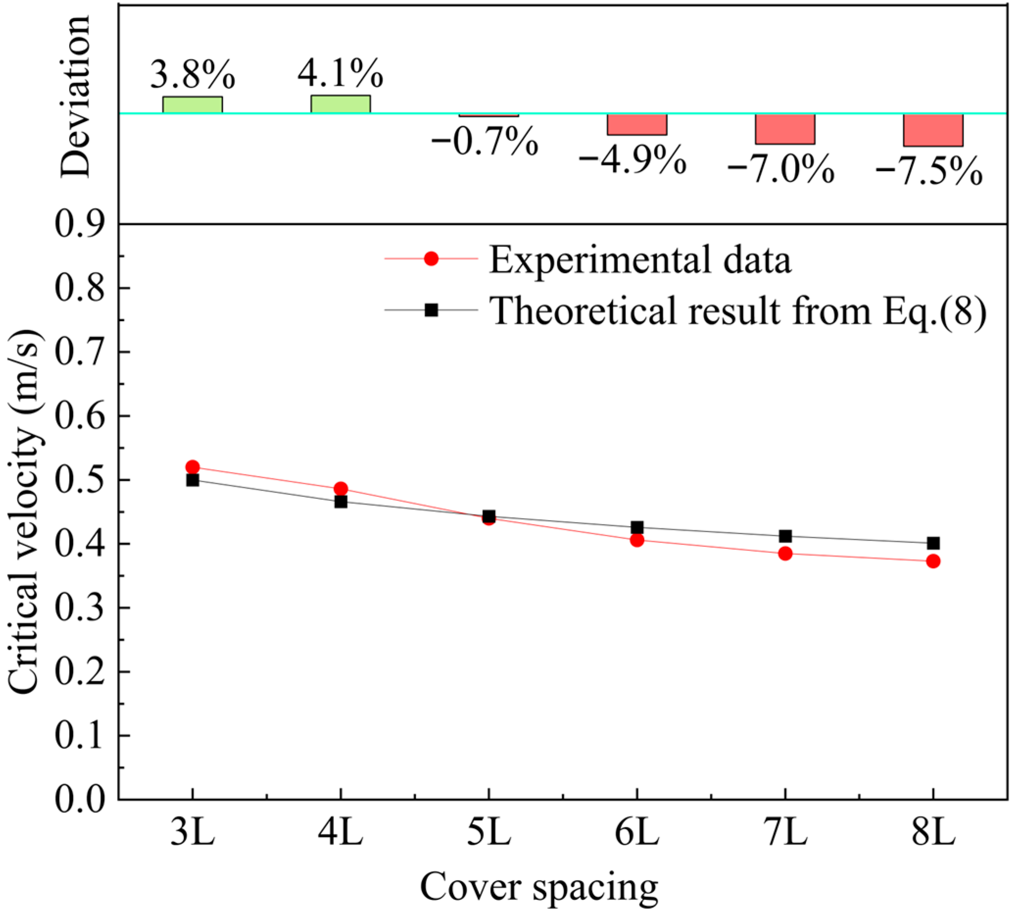 Section 3.3, it is confirmed that the variation trends of their critical velocities with a cover spacing are completely consistent, and the maximum deviation of the values under the same coverage ratio does not exceed 4.8% (much smaller than the test repeatability error), indicating that the stability control mechanism of different covering forms is uniformly dominated by the ACMs coverage ratio. Therefore, we select the representative -L-L-L- mode in engineering applications as the validation dataset of the theoretical model, which can not only accurately reflect the prediction reliability of the model but also avoid content redundancy caused by multi-form repeated validation.