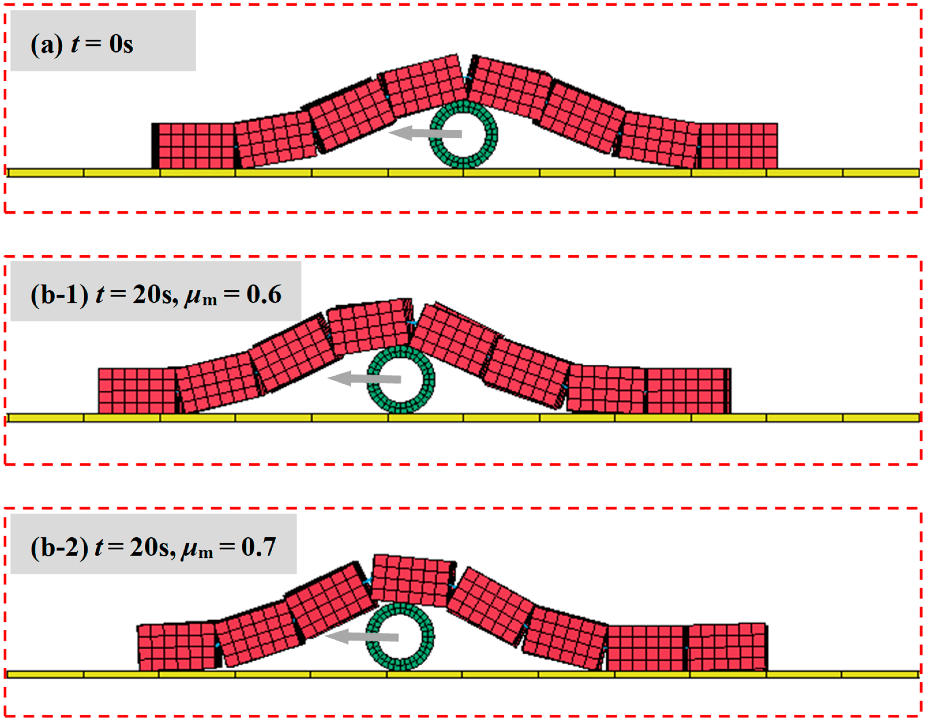 On the other hand, the theoretical model is applicable to the overall slip mode of the SCPS–ACMs, which occurs on a flat hard seabed with a relatively small friction coefficient. However, an actual hard seabed is usually composed of weathered rocks and reef limestone, with an irregular surface and a larger friction coefficient, so the instability mode of the SCPS–ACMs may change. Considering the site-specificity, finite element simulations are performed to capture the transformation of the instability mode under different friction coefficients. Firstly, the ACMs are laid on the SCPS under gravity and allowed to reach an equilibrium configuration. Then, a constant velocity is applied to the SCPS to make it slide forward slowly, and the ACMs are forced to move accordingly. The instability mode mainly depends on the constraint force (