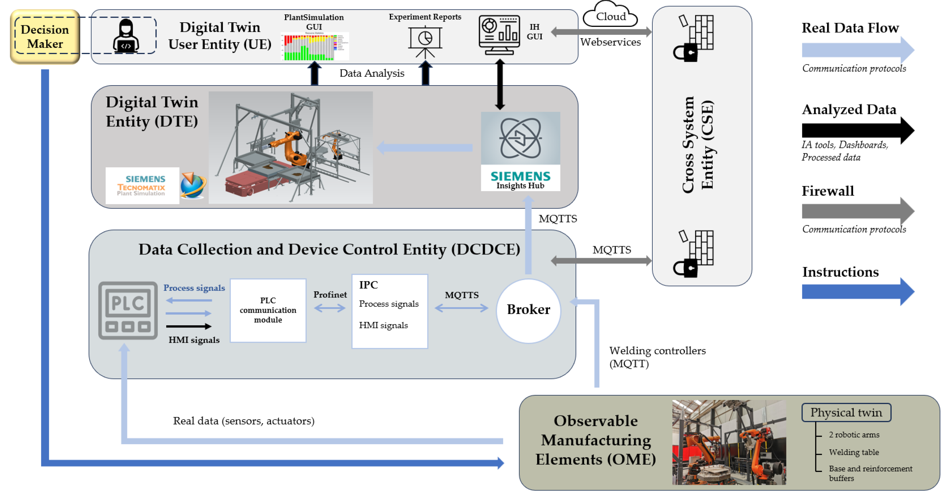 In our proposed framework, the DES-based model is embedded within this Core Entity, leveraging these functions to replicate the behavior of the welding process and to provide meaningful insights into system performance. Moreover, Siemens Insights Hub has also been positioned within the DTE, since its main role is to act as a cloud-based service platform for storing process data, enabling analytics, and exposing APIs that facilitate interoperability with the simulation environment. These functionalities correspond directly to the Resource Access and Interchange sub-entity, as defined by ISO 23247. While its graphical user interfaces support user interaction, its primary contribution to the architecture lies in the provision of services and data integration capabilities that strengthen the core of the digital twin.