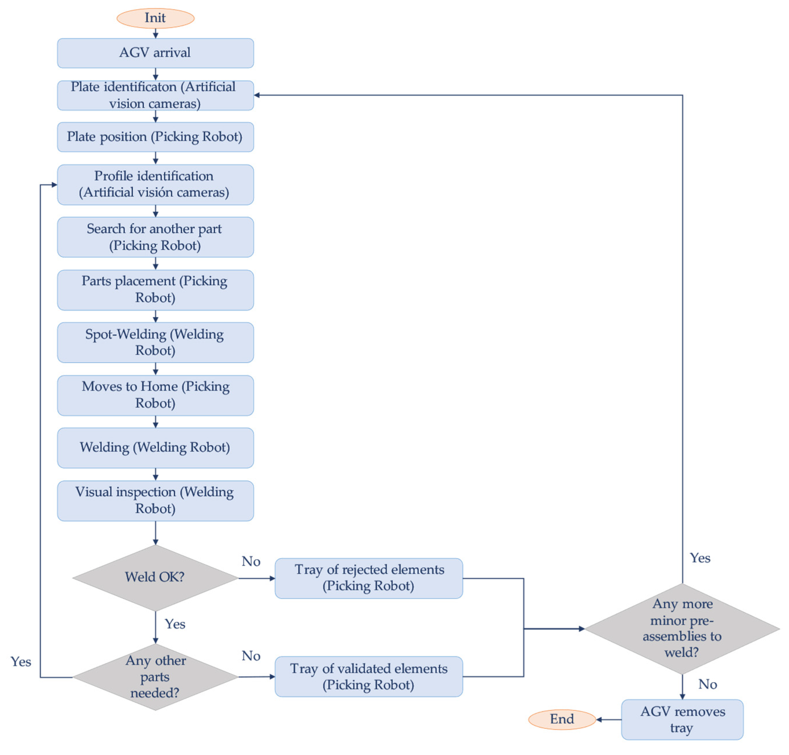 The final process, with the minor pre-assembly already welded and inspected, is its removal from the welding table to the corresponding tray. After finishing the manufacturing process, the AGV would remove the tray with the welded and valid minor pre-assemblies to continue with the process.
