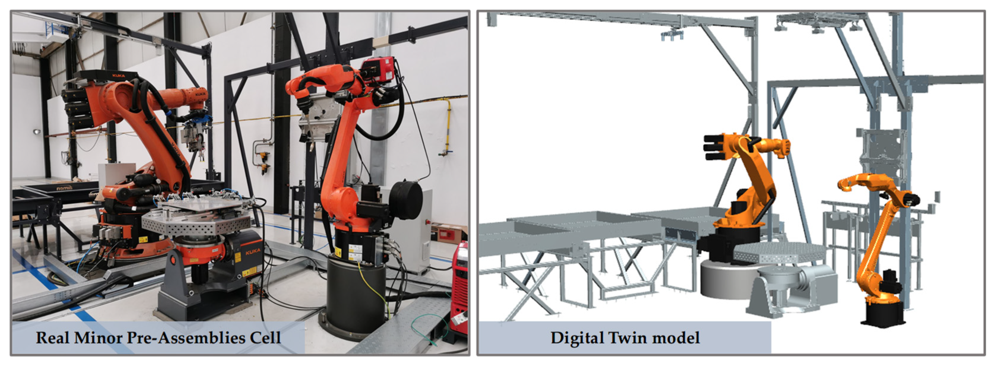In this article, the aim is to address this research gap by proposing a comprehensive framework for the development of process DTs in the naval sector and to present a case study evaluated in a minor pre-assembly cell at the Innovation and Robotics Center of NAVANTIA—Ferrol shipyard. The minor pre-assembly welding cell serves as an ideal testing ground, incorporating cutting-edge technologies such as robotics, artificial intelligence-automated welding, computer vision, visual inspection, and autonomous guided vehicles (AGVs).