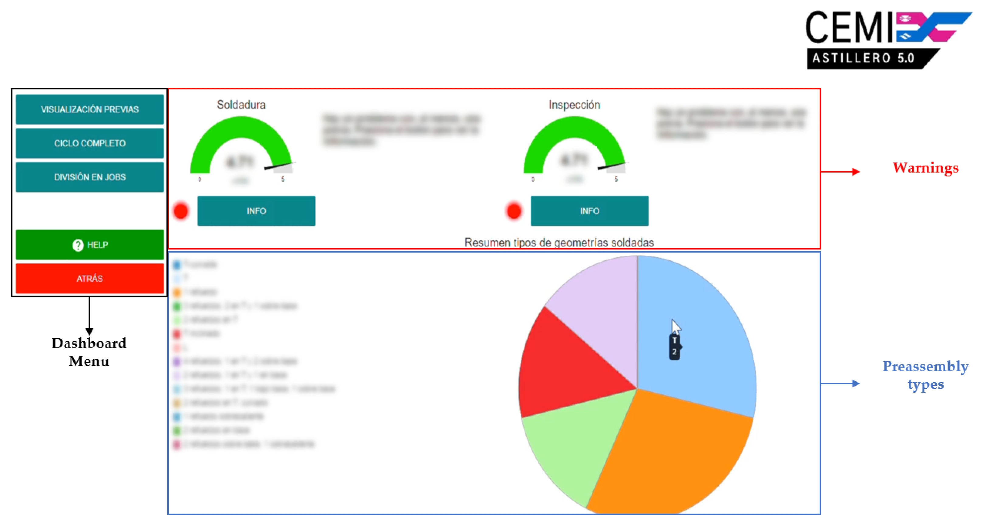 Once this selection is made, the API provides access to three main categories of information. First, the system reports warnings related to issues that occurred during welding and/or inspection, thus enabling the extraction of detailed diagnostic information. Second, it displays the type and proportion of preassemblies completed relative to the total, considering the multiple variants defined by geometry, size, and profile structure. Finally, the dashboard menu allows users to query three complementary aspects: (i) the visualization of previously manufactured subassemblies together with their associated attributes (e.g., identification number, processing time, welding and inspection speed); (ii) the statistical distribution characterizing the entire processing cycle; and (iii) the disaggregated statistical distributions by specific tasks, including part loading, positioning, welding, and inspection.
