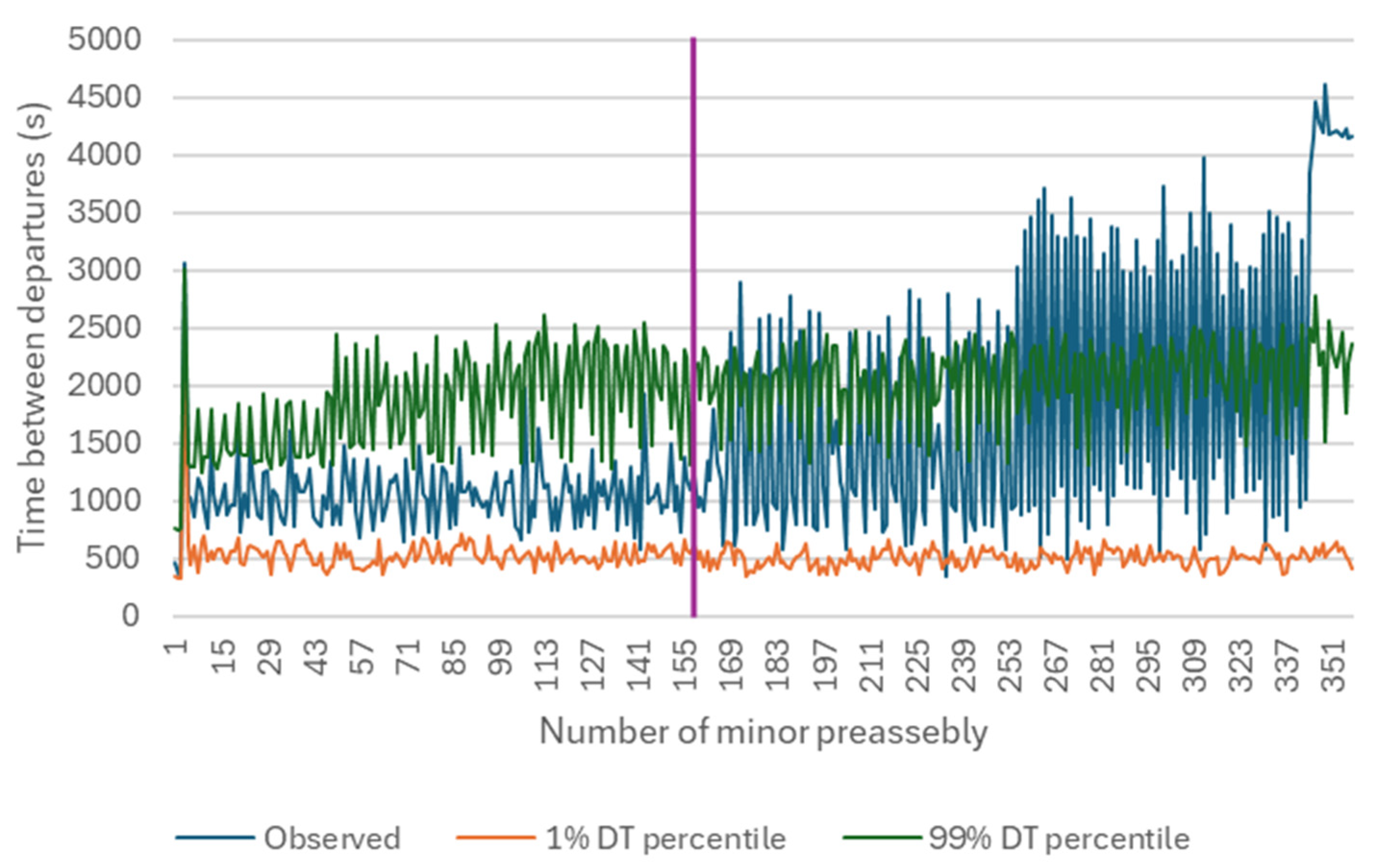Figure 11 shows the results obtained in this experiment. As we can see, once the anomaly in the workstation welding rate is introduced, the time between departures starts to frequently deviate beyond the normal 1–99% percentile of the simulated sample. This triggers alarms to inform the managers that there is a mismatch between the model and the real plant that would require further analysis to understand the causes.