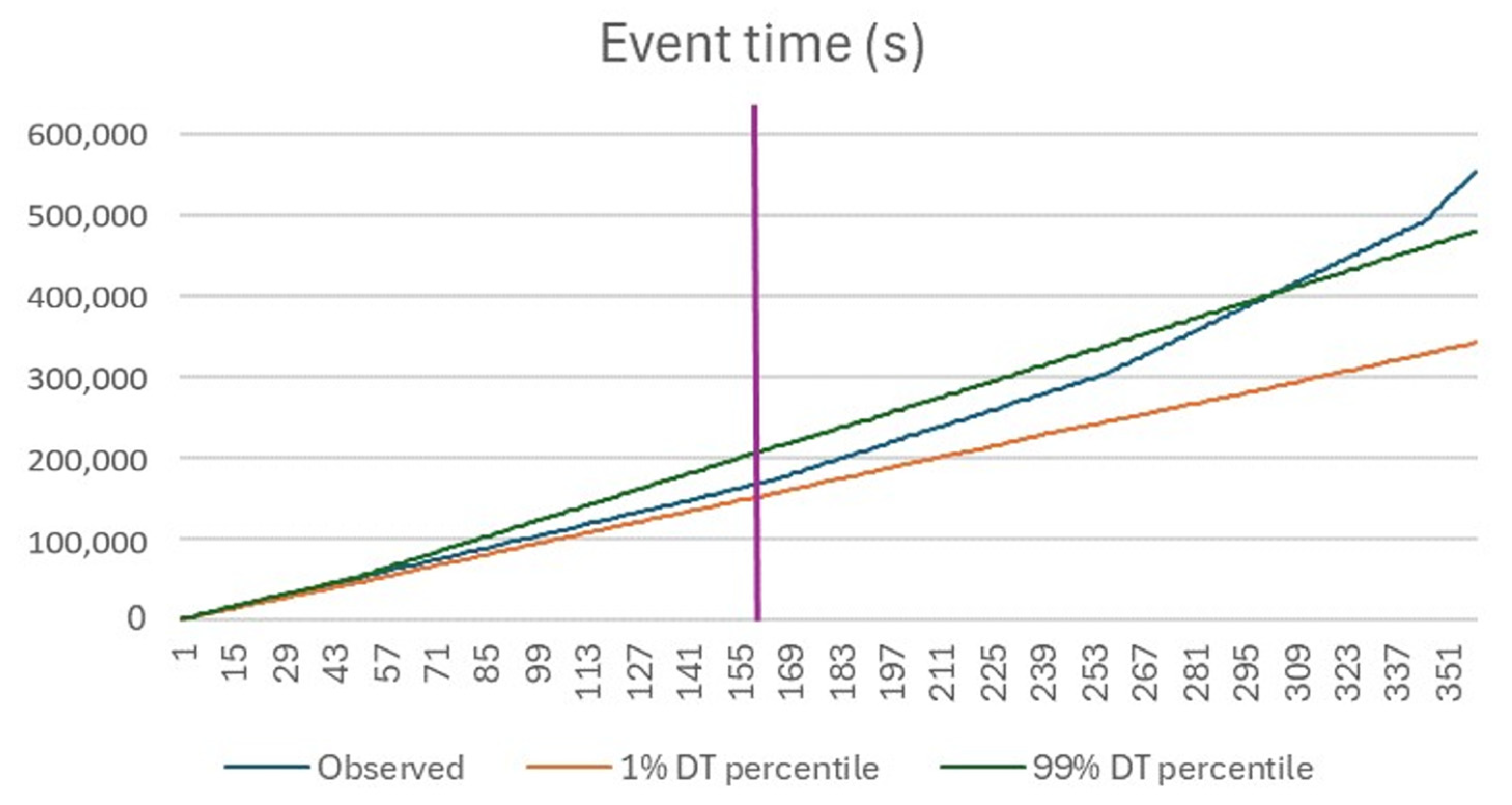 We can then obtain the percentile of the observed value in the empirical sample. Let be the percentile of the observed value in the empirical sample . Then, if we set a confidence level for the null hypothesis that the event time follows the empirical distribution, we will reject it if or . If we reject the null hypothesis, then we would trigger the alarm in the DT signaling that there has been a significant deviation. The value to trigger the alarm should not be too high because otherwise the DT will trigger alarms constantly.