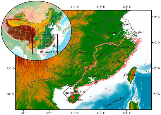 Hainan Island is situated at the southwestern edge of the southeast coast of China, and is separated from the South China Block by the Qiongzhou Strait (Figure 1). Seismic imaging has uncovered a columnar low-velocity body under Hainan Island, which is believed to extend into the deeper mantle. The radius of this structure is estimated to range between 40 and 80 km [6,7,8]. Petrological and seismological studies estimate the excess temperature of the plume ranges from 140 to 200 K [9]. Geochemical data suggest that the ocean island basalts (OIBs) found on Hainan Island are likely sourced from deep regions within the Earth’s interior, potentially originating from the lower mantle [10,11,12]. In summary, multiple independent studies from seismic tomography, petrology and seismology, and geochemistry all provide robust evidence for a mantle plume located underneath the Hainan area.