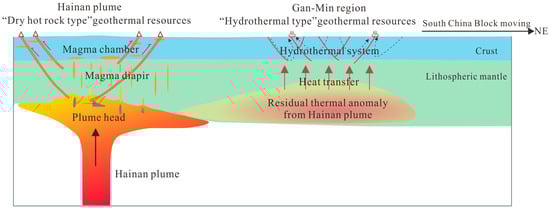 On the basis of the spatial offset of low-velocity zones and the distribution of heat flow anomalies, we propose a coupled geodynamic model of mantle plume activity and plate motion. This model illustrates that the lithosphere’s thermal anomaly, along with the low-velocity anomaly observed in the Gan–Min area, is caused by thermal contributions from a combination of the Hainan plume and the ongoing northeastward movement of the South China Plate since 80 Ma. The Gan–Min region is characterized by well-defined faults and a significant abundance of hot springs, with hydrothermal geothermal resources being the predominant type [74]. The fundamental elements for the formation of a hydrothermal circulation system are conduits (faults), fluids, and heat sources. In the Gan–Min region, residual heat from the Hainan plume (lithospheric thermal anomalies) and radiogenic heat sources may constitute the primary driving forces of the hydrothermal circulation system (Figure 8). Numerous deep-seated faults cutting down to the Moho or the lithospheric scale have developed on Hainan Island, including the Maniu–Puqian, Wangwu–Wenjiao, and Jiusuo–Lingshui faults. Moreover, significant volcanic formations from the Quaternary period have emerged, positioning Hainan Island as one of China’s most recently active volcanic areas [75,76,77]. Initial research suggests that the geothermal resources of Hainan Island are primarily of the hot dry rock type. Frequent Quaternary volcanic activity may have caused magma to erupt to the surface along deep-seated fault zones, while the portions that did not erupt remained in the crust, existing as localized magma chambers and forming hot dry rock resources in their surrounding areas [74,78,79]. This research shows that the thermal anomalies in the lithosphere, generated by the Hainan plume, migrate beneath the Gan–Min region along with the motion of the South China Plate. The lithosphere under Hainan Island has not experienced significant thermal perturbation, and the heat flow (65~70 mW/m2) does not exhibit prominent anomalies. However, some local areas of Hainan Island still exhibit high heat flow (>75 mW/m2). Taking into account the tectonic context of the area, it can be deduced that the patterns of high heat flow anomalies and volcanic materials in the region might be influenced by significant deep-rooted faults (Figure 8). Faults in the region create routes for magma to rise, thus making Hainan Island a prime location for the accumulation of hot dry rock resources.
