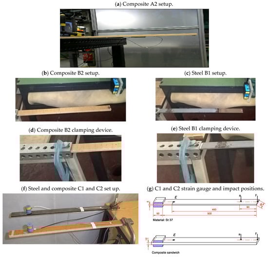 Experiments for both steel and composite specimens were performed as detailed below, where the comparison among all participants is summarized. Participant A, as reported in Figure 2a, used an instrumented hammer, a lightweight accelerometer (Brüel & Kjær Type Number: 4375 with operational range of 5000 g and shock-peak resistance of 25,000 g, [7]), and Dewetron data acquisition and processing software (Dewesoft, [8]). For both steel and composite specimens, the same setup was adopted. A 1000 mm long strip was clamped on a heavy table, and a free span of 500 mm was created. Natural frequencies were derived using both the accelerometer placed at the free end and at the midpoint along the specimen’s free span. The hammer impact location was similar to the accelerometer position on the opposite side of the specimen. For each condition, hammer excitation was performed five times per position in order to increase the reliability of the input signals (see Figure 3a). The data processing was performed by the software, showing the FFT, the frequency transfer, and the clamping values. As far as steel specimens are concerned, the first natural frequency was found to be the same for both positions. Differences occurred in the higher-order modes, but these are not further discussed. For composite specimens, a small deviation was found in natural frequency depending on the impact location. The mass of the accelerometer closer to the free edge resulted in a lower natural frequency, which was expected. Compared to the weight of the composite specimen, the weight of the accelerometer was, in fact, not negligible.