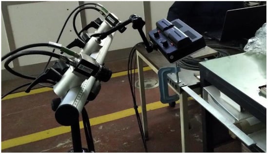 Participant B used the Dantec DIC Q400 System with two 3.1 MPix USB3 cameras. It was necessary to prepare the specimens’ surfaces using a spray painter to create a series of visible points in the digital images that could be detected by the two cameras. Numerous tests were carried out to obtain a suitable pattern. Finally, a white background and black speckles were created. It took some practice to obtain a suitable pattern whose speckles are sufficiently refined but well-separated from the background, allowing sufficient contrast. The beams were clamped on a heavy table, and the two cameras were set in the best position to acquire images, according to Dantec’s instruction manual (Figure 4) [10]. It is suggested to have a distance between them of about half a meter and a 90° angle, in such a way that the line of sight of each camera is approximately 45°.