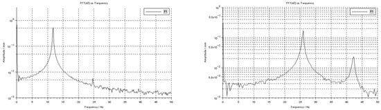 For steel specimens, DFT was used to determine eigenvalues (frequencies) using the transversal x- and vertical y-displacement signals from point “tip2” at the end of the beam. As shown in Figure A3 and Figure A4, the first natural frequencies result, respectively, 15.3 Hz for the F1 specimen and 15.5 Hz for the F2 specimen.