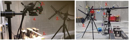 Displacement measurement with a DIC system (composite on the left and steel on the right): 1—cantilevered beam; 2—calibration cross; 3—a pair of high-speed cameras; 4—headlight.