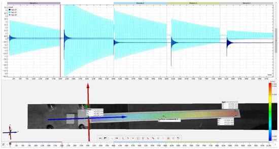 Out-of-plane displacement of the beams was excited in a pull-and-release mode. For composites, the displacements were monitored at two facet points (in the following text referred to as simply Point 1 and Point 2) on the beams (Figure 10). For steel specimens, the two facet points were set on the tip of the beam (see Figure 11).