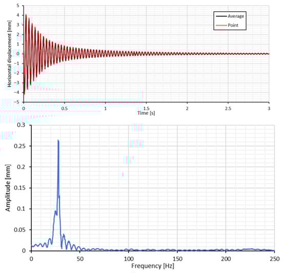 Calibration images and measurements were acquired utilizing Vic-snap software, too. The sample underwent excitation through horizontal force applied via an Allen key at its lowest corner, followed by its release to facilitate free vibration. Measurements spanning approximately 20 s were recorded. Subsequent to recording the vibrations, the gathered data underwent analysis using the Frequency Analyzer tool integrated into the Vic-3D software. A calibration routine was executed within the program to generate a calibrated database. To minimize projection error, the “Auto Correct Calibration” function was employed, successfully reducing the error to 0.05 mm. During data analysis, initial displacements were excluded from consideration. To determine the first eigenmode, horizontal displacements were calculated from the images, both as an average over the defined area of interest and from a specific point, as illustrated in Figure 13. Figure 14 displays a three-second excerpt from the measured time history, wherein the phase of average displacement over the area and displacement at the point closely correspond. Consequently, the Fast Fourier Transform (FFT) was applied exclusively to the average area using the tool. The FFT results indicated the highest amplitude, identifying the first natural frequency as 28 ± 0.2 Hz, which is approximately 10 percent higher but consistent with the DIC results reported in the earlier benchmark tests.