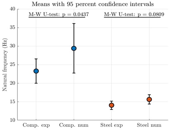 The coefficient of variation describes the size of the standard deviation in relation to the mean, expressed as a percentage. Simply put, the larger the coefficient of variation, the larger the uncertainty. Coefficient of variation results are included in Table 8 along with the confidence intervals and the p-values of the Mann–Whitney U-test. The largest coefficient of variation is observed for experimentally identified natural frequencies of composite specimens. Numerically calculated frequencies show a smaller CoV, but it is still larger than the corresponding value for steel.