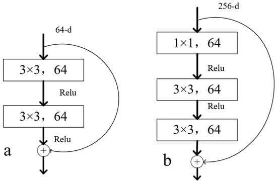 The residual block structures in ResNet: Basicblock (a) and bottleneckblock (b).