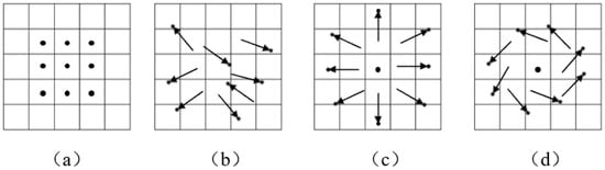 Illustration of sampling patterns in convolution operations: (a) Conventional 3 × 3 times 3 × 3 convolution with fixed sampling locations. (b) Deformable convolution with learnable offsets. (c,d) Two examples of variant deformable sampling patterns.