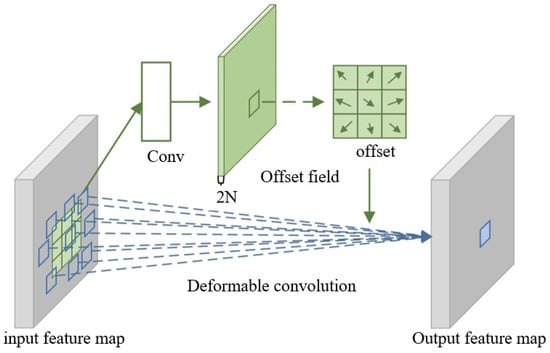 The concept of deformable convolution was first proposed in 2017 [19], aiming to improve the convolutional neural network’s adaptability to geometric transformations of objects. Unlike standard convolution that samples feature from fixed spatial positions, deformable convolution introduces learnable offsets on top of the standard sampling grid. These offsets allow the sampling locations of the convolutional kernel to be dynamically adjusted based on the input features, thereby enabling the network to more effectively capture local structure variations and deformation patterns in the image, as illustrated in Figure 3.