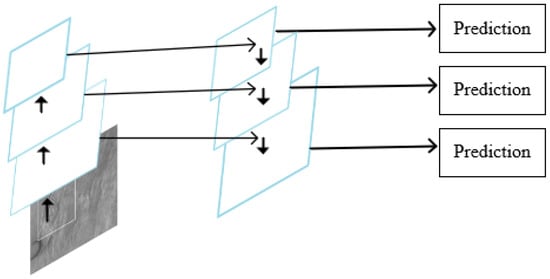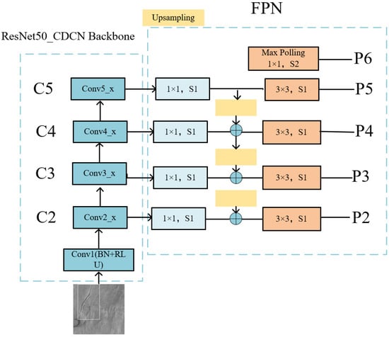 Convolutional neural networks typically utilize the feature maps from the final layer as inputs for subsequent components. Since deeper feature maps contain more abstract semantic information, they are beneficial for object recognition and classification tasks. Moreover, this approach reduces computational costs and enhances detection speed. However, when addressing multi-scale variations, most networks rely on a single high-level feature map for downsampling, which can lead to the loss of small objects containing limited feature information. To overcome this problem, Lin et al. [23] proposed the Feature Pyramid Network (FPN), a structure designed to fuse multi-scale features effectively. The architecture of the FPN is illustrated in Figure 6.
