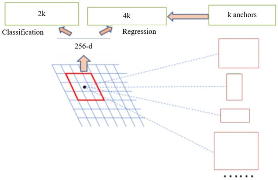 Faster R-CNN directly uses the Region Proposal Network (RPN) to generate object proposals. The main process is as follows: each feature point is first mapped back to the center of its receptive field in the original image, serving as a reference point. Then, K anchors of different scales and aspect ratios are placed around this point. A 1 × 1 convolution is used on the low-dimensional feature map. It outputs 2K classification scores (foreground or background) and 4K bounding box regression offsets at each reference point, as shown in Figure 8.