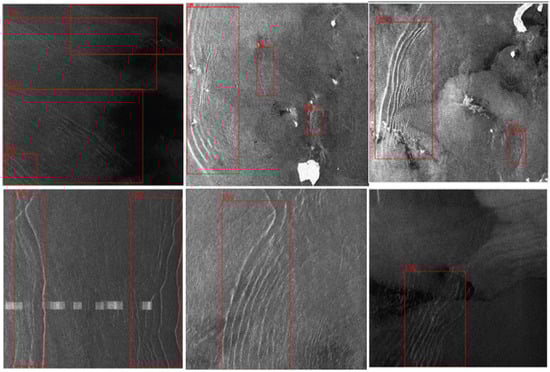 The quality of the training dataset is a key factor influencing the accuracy of deep learning-based object detection models [25,26]. In this study, we utilize the publicly available ocean internal wave dataset, namely the S1-IW-2023 Dataset [27] (https://doi.org/10.5281/zenodo.11090328, accessed on 30 April 2024)), as the primary source of SAR imagery for model training and evaluation, which contains 742 SAR images of internal waves and their corresponding annotation files collected from June 2014 to February 2023. All images in the dataset are sourced from the Sentinel-1 satellite. Additionally, this study has gathered supplementary SAR images containing internal wave information captured by the Sentinel-1 satellite over the South China Sea and the Andaman Sea regions. Through manual annotation and image preprocessing, a supplementary dataset comprising 1133 SAR images was constructed. The dataset was split into training and validation sets with an 8:2 ratio. Some typical training samples of SAR images are shown in Figure 10 (the red bounding boxes are the marked internal wave region).