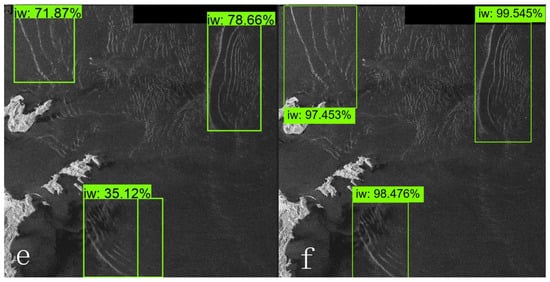 In summary, the improved Faster R-CNN model demonstrates the best overall performance among the evaluated methods. It effectively reduces missed detections during the detection process while achieving higher object confidence scores and more accurate bounding box localization, highlighting its strong feature representation capability and robust object discrimination ability. Although the inference speed of the proposed model is not the fastest, real-time performance is not a strict requirement for the current task of ocean internal wave detection. Therefore, achieving baseline efficiency is sufficient, and a moderate sacrifice in detection speed in exchange for higher accuracy is both reasonable and acceptable. Experimental results further confirm that the proposed model can recognize ocean internal waves accurately and stably, indicating promising application potential and practical value (Figure 12).