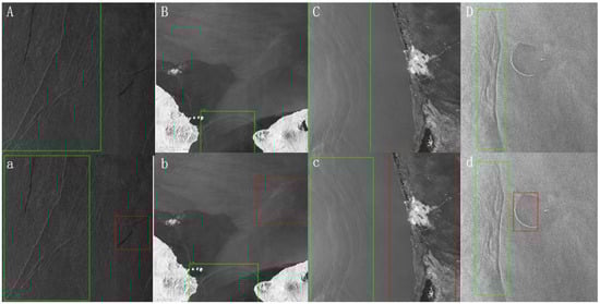 Panoramic SAR image detection of internal waves under complex interference. The figure presents detection results in four representative and challenging SAR scenarios: (a) oil spill interference, (b) wave-field scenes, (c) coastal regions, and (d) island-dominated areas. For each scenario, panels (A–D) show the results of the proposed rFaster R-CNN, while panels (a–d) present the results obtained by replacing only the backbone with ResNet-50. True positive detections are marked in green, and false positives are indicated in red.
